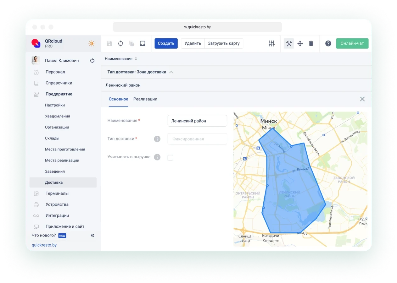 Можно включить автоматический расчёт стоимости доставки по зонам города или поставить фиксированную стоимость для всех заказов.