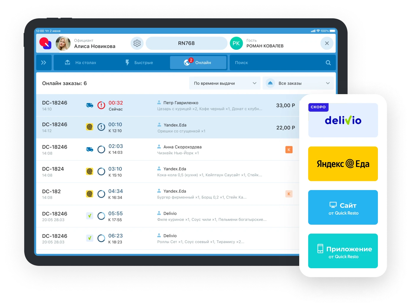 Автоматизация доставки еды позволит масштабировать бизнес. Привлекайте заказы через собственный сайт заведения или приложение. Подключайтесь к агрегаторам Яндекс.Еда и Delivery Club и расширяйте базу клиентов. Модуль доставки освобождает от установки множества приложений. Заказы из агрегаторов, с сайта и мобильного приложения для гостей отображаются в едином интерфейсе. Обрабатывай заказы с того же терминала, который используется в зале. Автоматизация превращает бизнес-процессы в слаженный механизм. Заказ из мобильного приложения приходит на кассовый терминал. Повара видят новые заказы на собственном экране на кухне. Программа подаст повару звуковой сигнал и посчитает затраченное время приготовления. Для сборщика заказов печатается специальный чек. Сотрудник сразу понимает, что и где забрать, и не тратит лишнее время. А довольный гость быстро получает заказ и оставляет хороший отзыв о скорости обслуживания. Распредели доставку еды между курьерами агрегаторов и своими сотрудниками. Это поможет в пиковые часы заказов. Управление происходит прямо с кассового терминала. Если заказ просрочен, кассовый терминал сообщит в уведомлении. Введите имя или телефон клента — карточка с адресом доставки отобразится на экране. Если гость ещё ничего не заказывал, карточку можно быстро создать. Гость видит акции и статусы заказа в личном кабинете: оплачен, отправлен на кухню, готов. А потом можно оставить отзыв или повторить свой заказ.Модуль расчета доставки