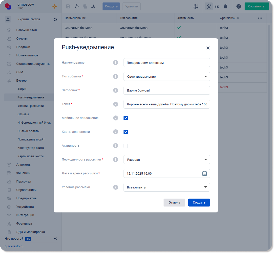 Рассылка будет доступна клиентам с выбранным полом. Пол клиента указывается в разделе CRM — Клиенты, либо на кассовом терминале при авторизации гостя. |