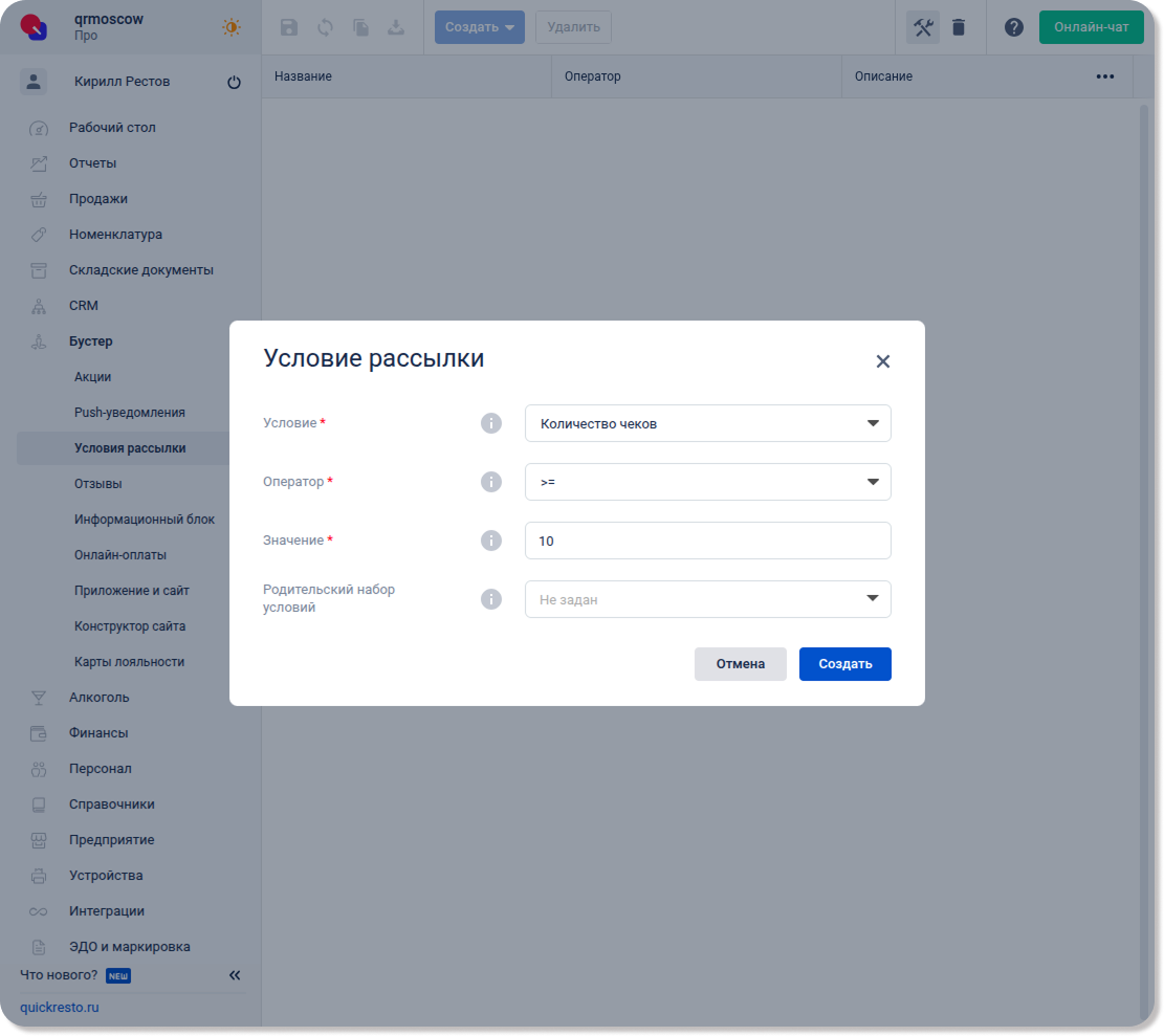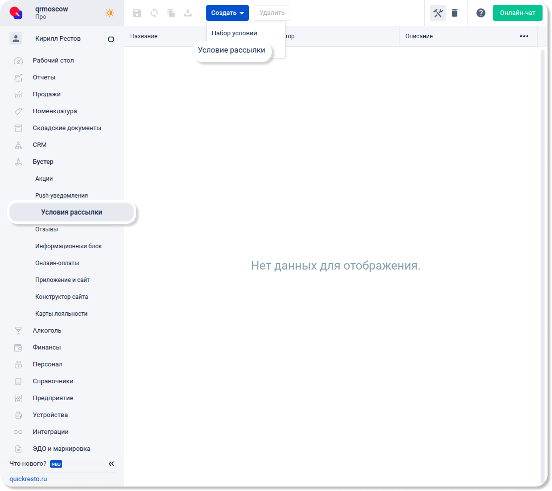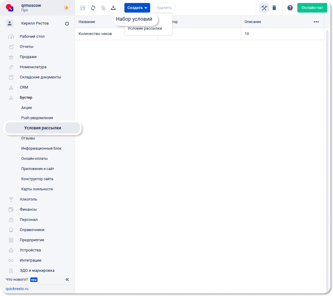 Перейдите в раздел Бустер — Условия рассылки, нажмите Создать и выберите Условие рассылки.
