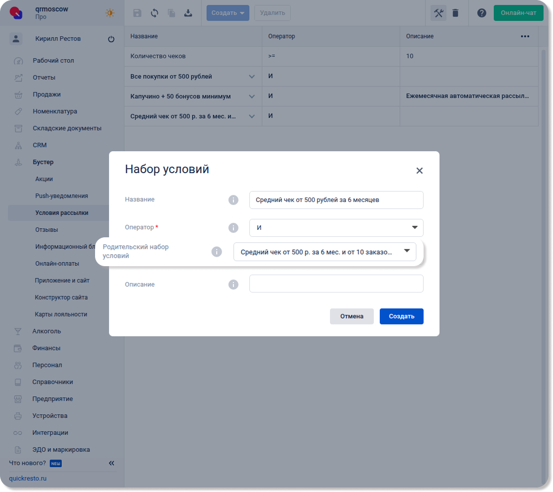 Перейдите в раздел Бустер — Условия рассылки, нажмите Создать и выберите Набор условий.