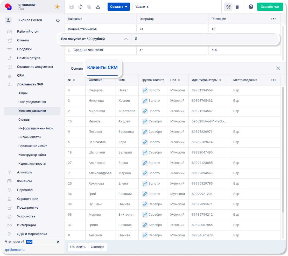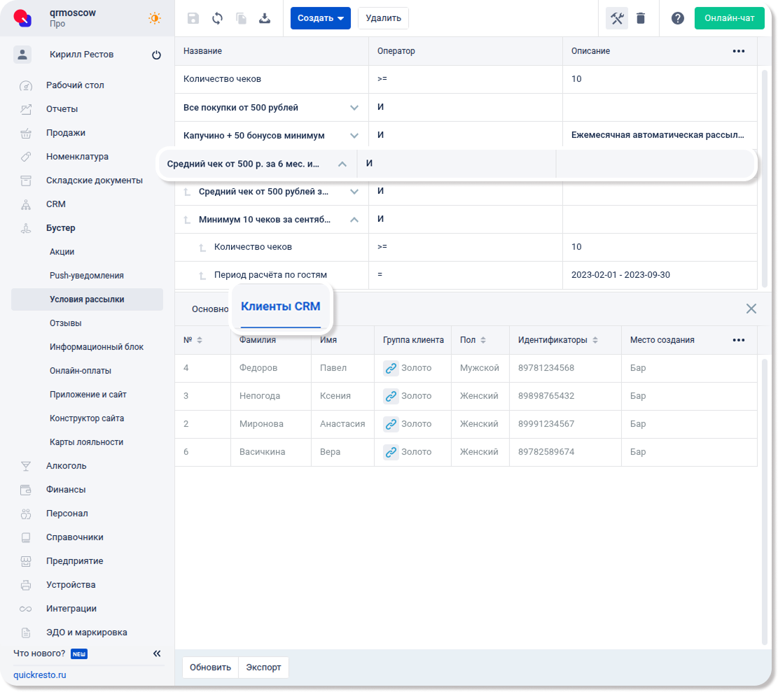 На вкладке Клиенты CRM в параметрах набора условий можно просмотреть клиентов, которые удовлетворяют данному набору и получат уведомление при рассылке с ним.