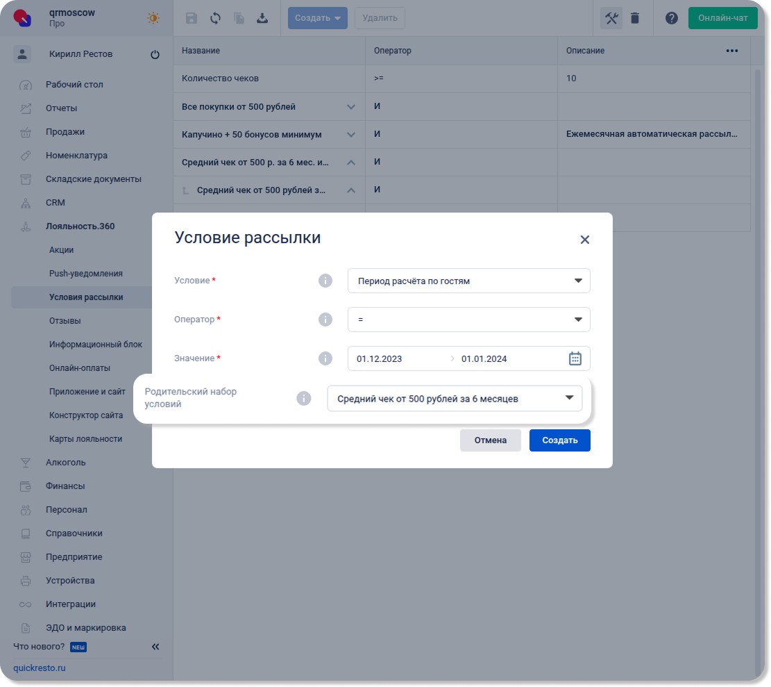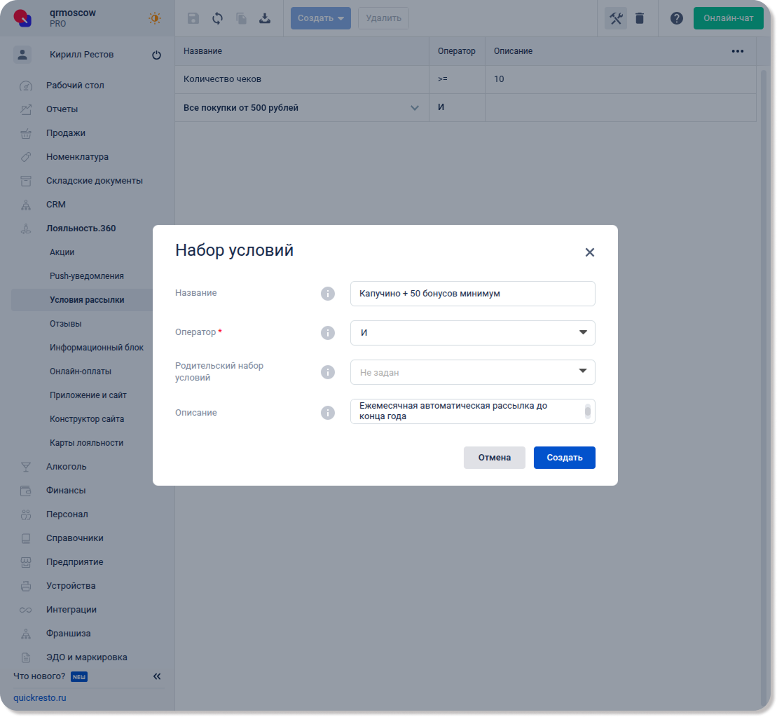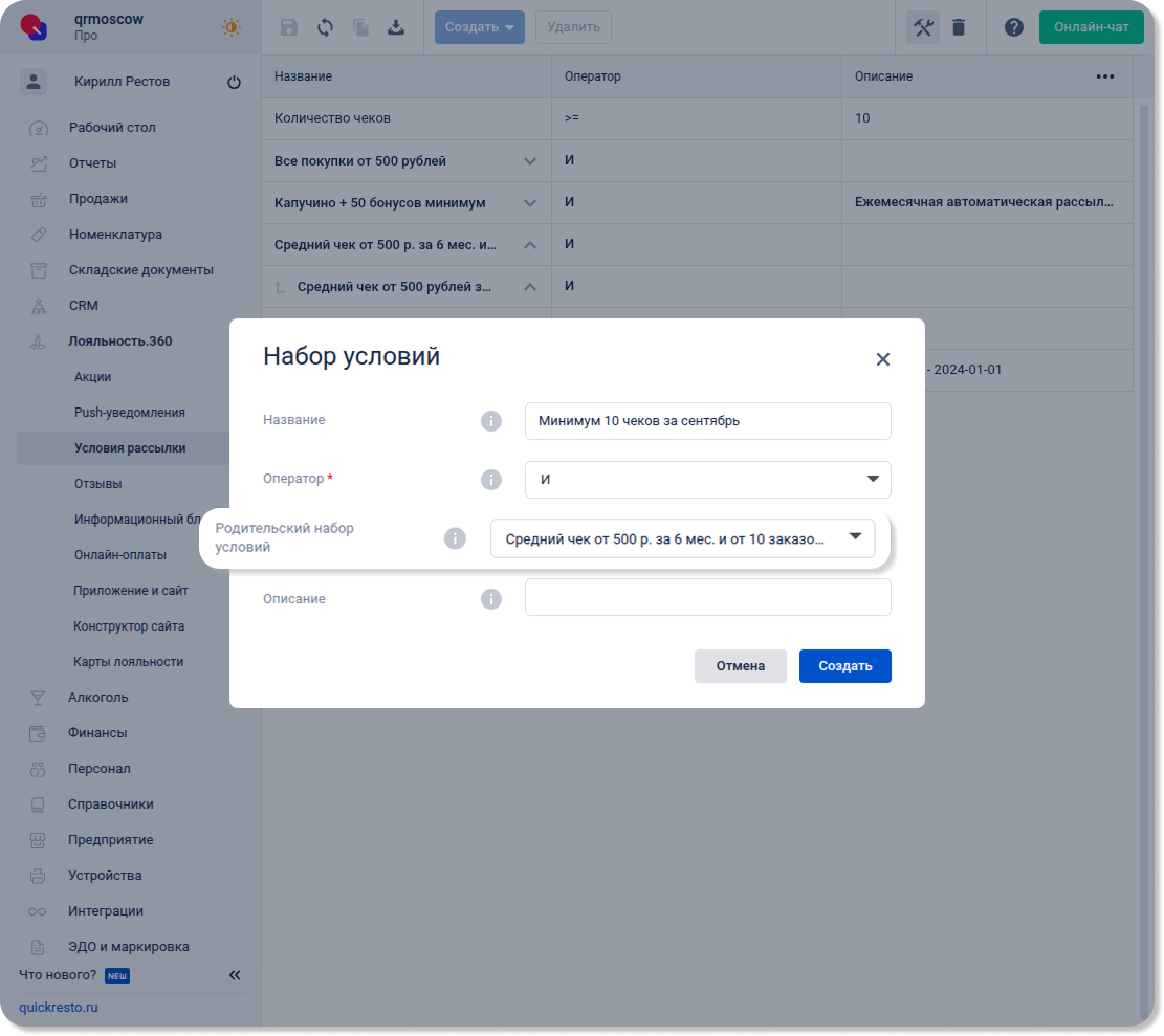 Перейдите в раздел Лояльность.360 — Условия рассылки, нажмите Создать и выберите Набор условий.