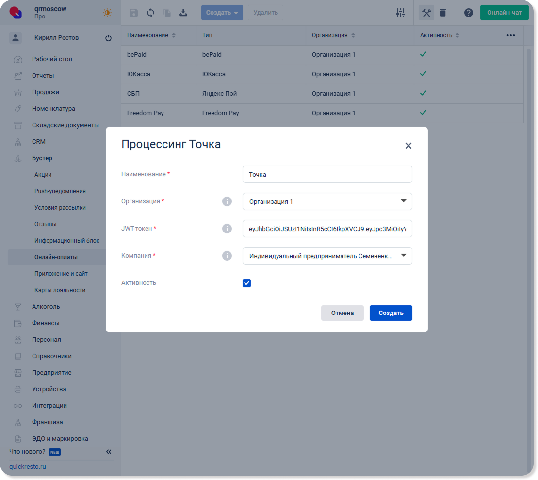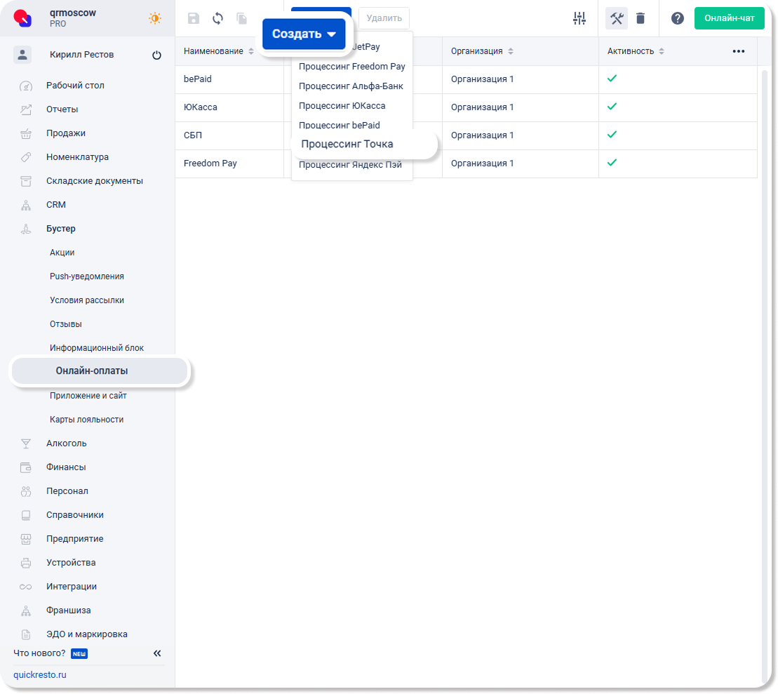 После подключения интеграции, в бэк-офисе перейдите в раздел Бустер — Онлайн-оплаты — Нажмите Создать на верхней панели инструментов и в выпадающем меню выберите Процессинг Точка.