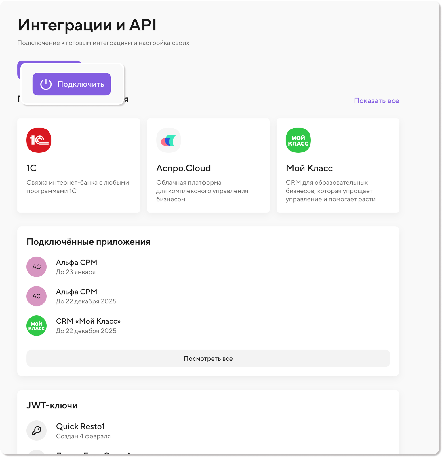 2) В разделе сервиса Интеграции и API нажмите на кнопку Подключить.