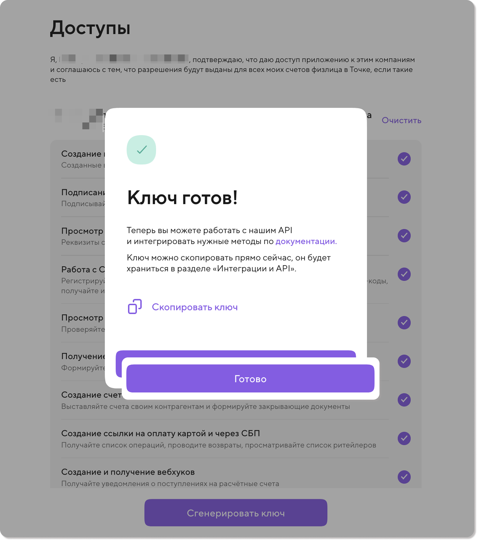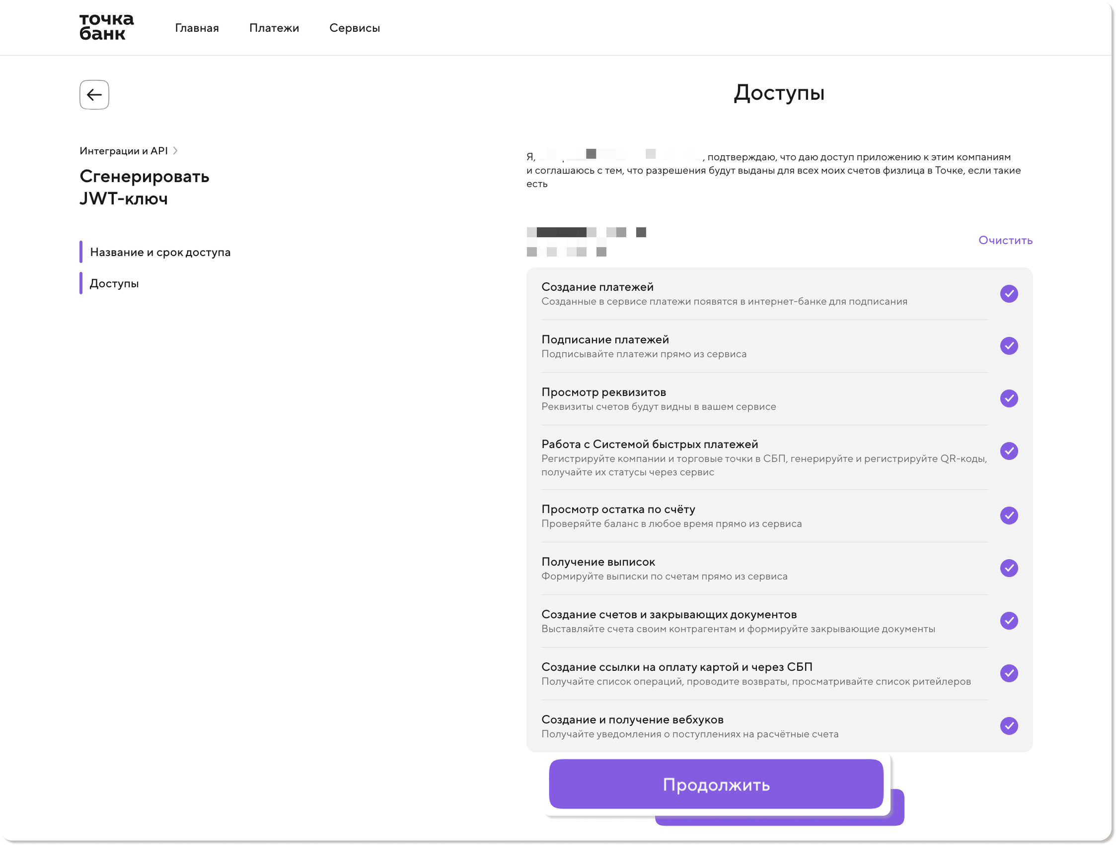 5) Определите права доступа для ключа. Вы можете выбрать все доступные права или ограничиться обязательными для интернет-эквайринга: Создание ссылки на оплату картой и через СБП и Создание и получение вебхуков. После выбора нажмите Продолжить.