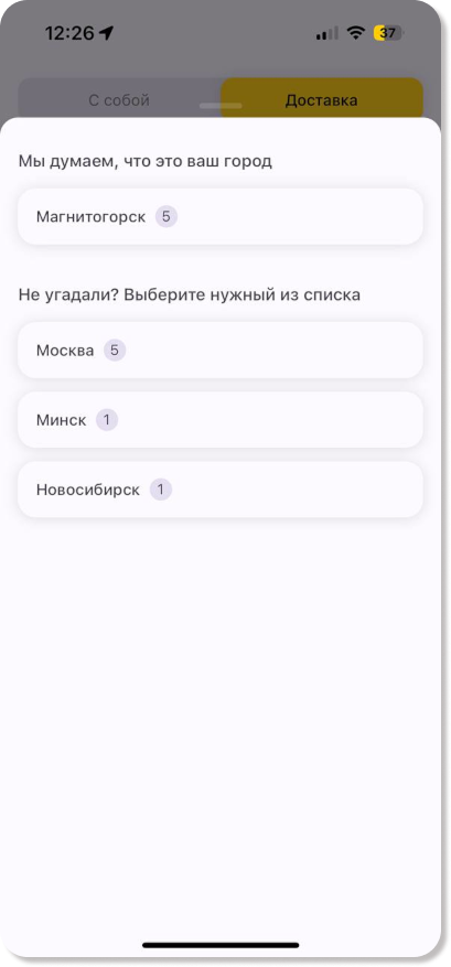 Нажав на поле с названием города, можно увидеть количество заведений в другом городе и выбрать нужный вариант.