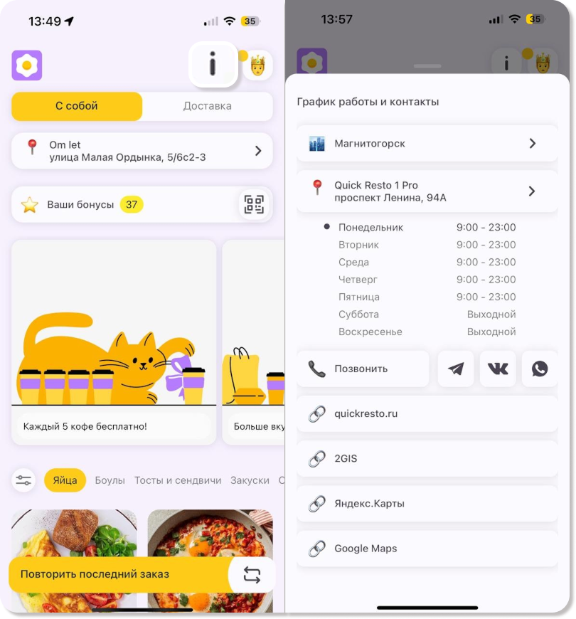 Заведение с заполненной информацией будет отображаться в приложении для гостей, при нажатии на кнопку i на верхней панели инструментов. Снизу отобразится график работы, контакты и месторасположения заведения на различных картах.