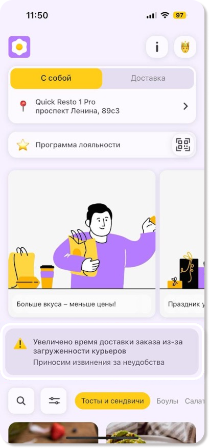 Существуют ситуации, когда заведению необходимо донести важную информацию гостю. Например, отключение электроэнергии в заведении; более долгое ожидание доставки из-за загруженности; временное отсутствие одного из способов оплаты и другое.