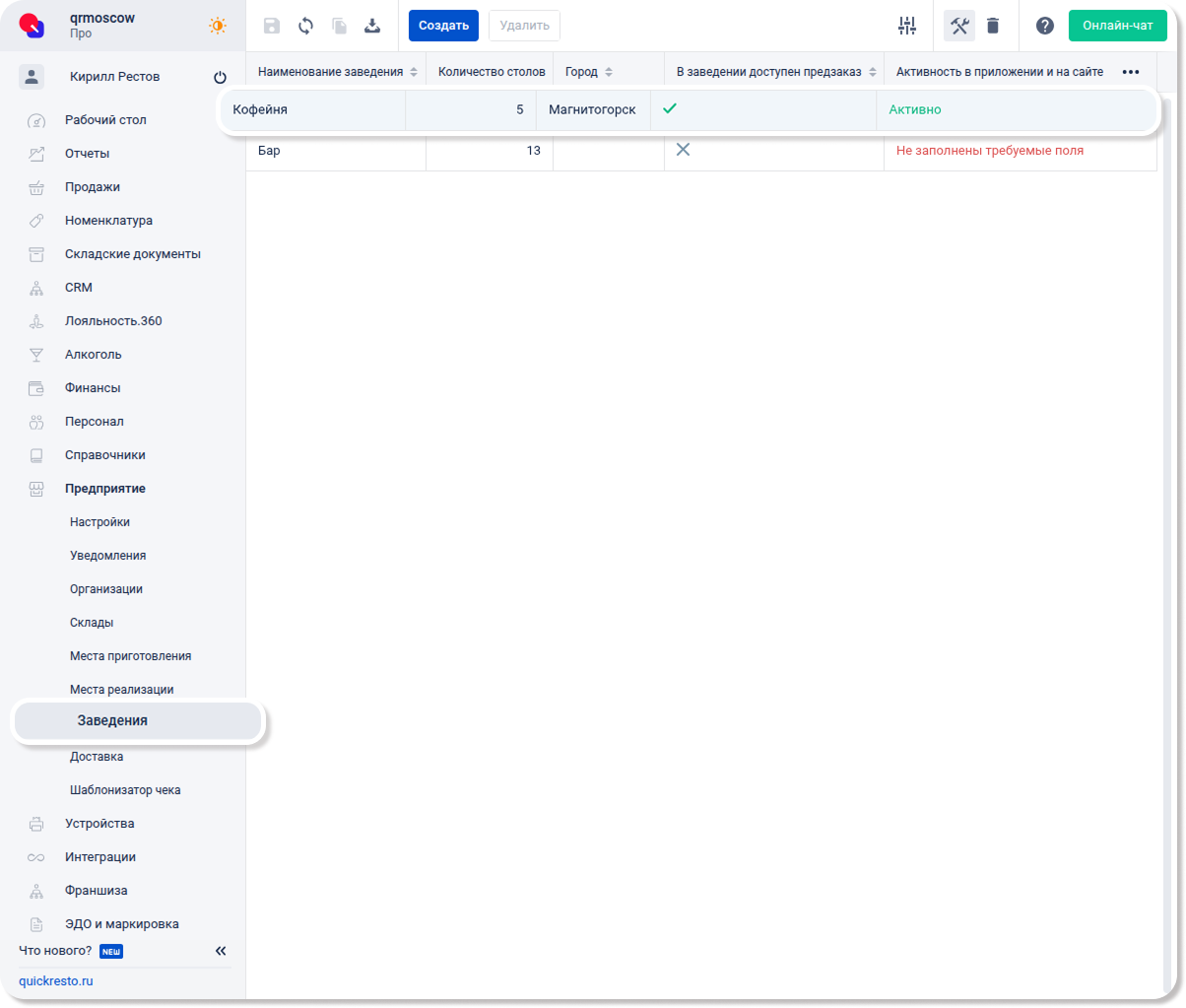 Затем перейдите в раздел Предприятие — Заведения и выберите заведение, для которого необходимо настроить фиксированную доставку.