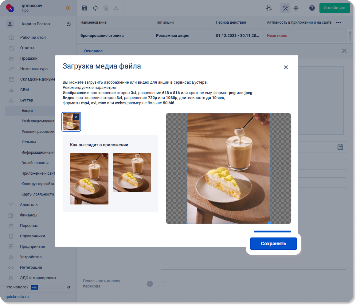 6. Когда изображение или видео загрузится, вы сможете увидеть и отредактировать, как оно должно отображаться в киоске самообслуживания. После этого нажмите на кнопку Сохранить.