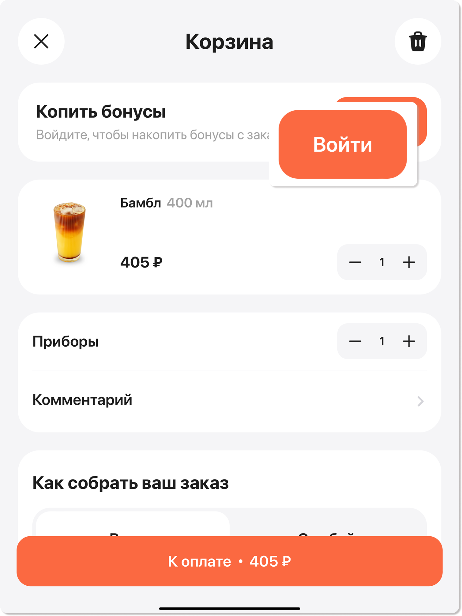 2. Добавить все необходимые позиции в заказ. Затем нажать на кнопку Корзина в нижней части экрана.