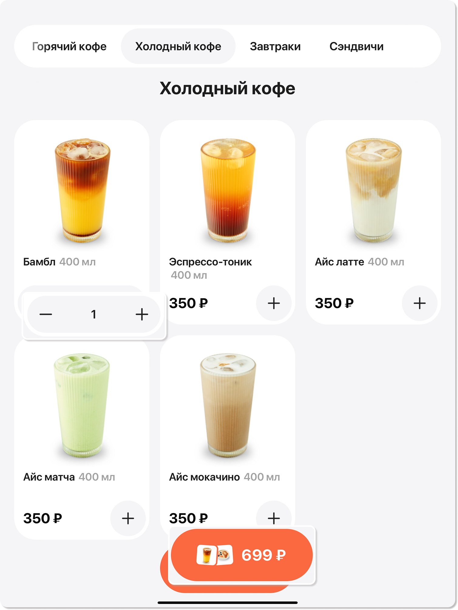 Для получения детальной информации о блюде или выбора модификаторов нажмите кнопку «+» рядом с указанной ценой.