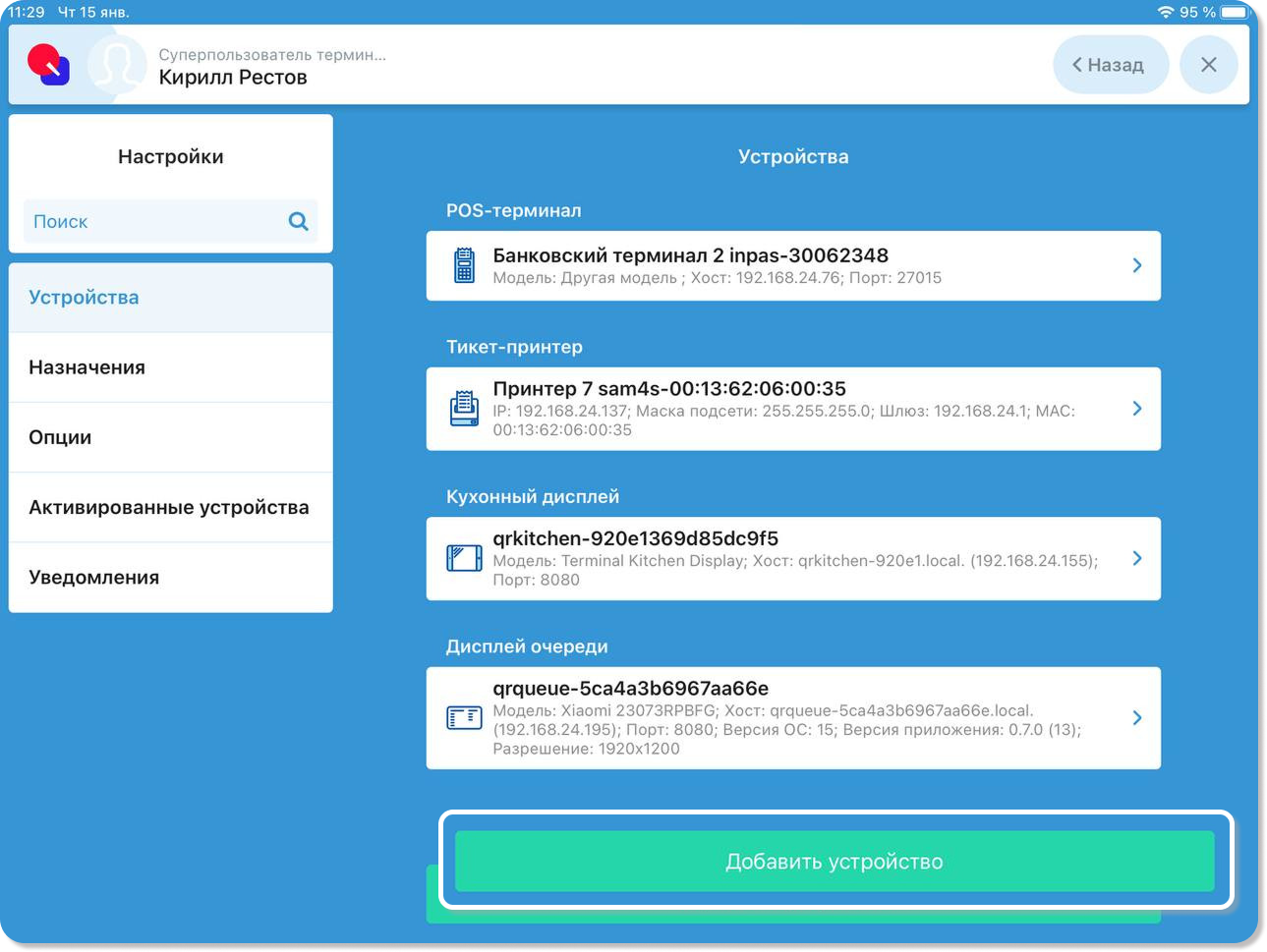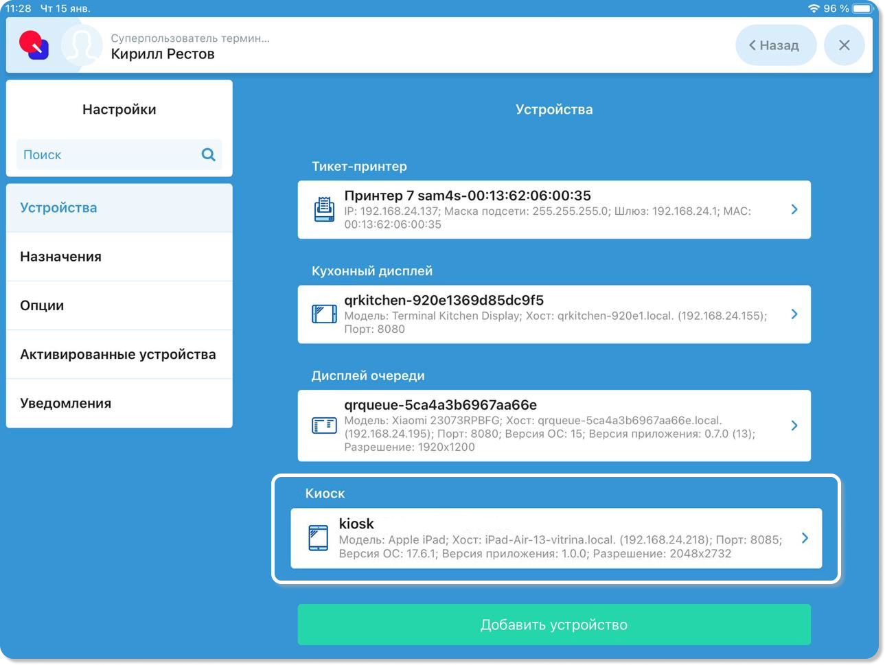 Примечание! При необходимости в поле Имя устройства можно ввести имя киоск, чтобы он отображался в списке заказов именно под этим именем.