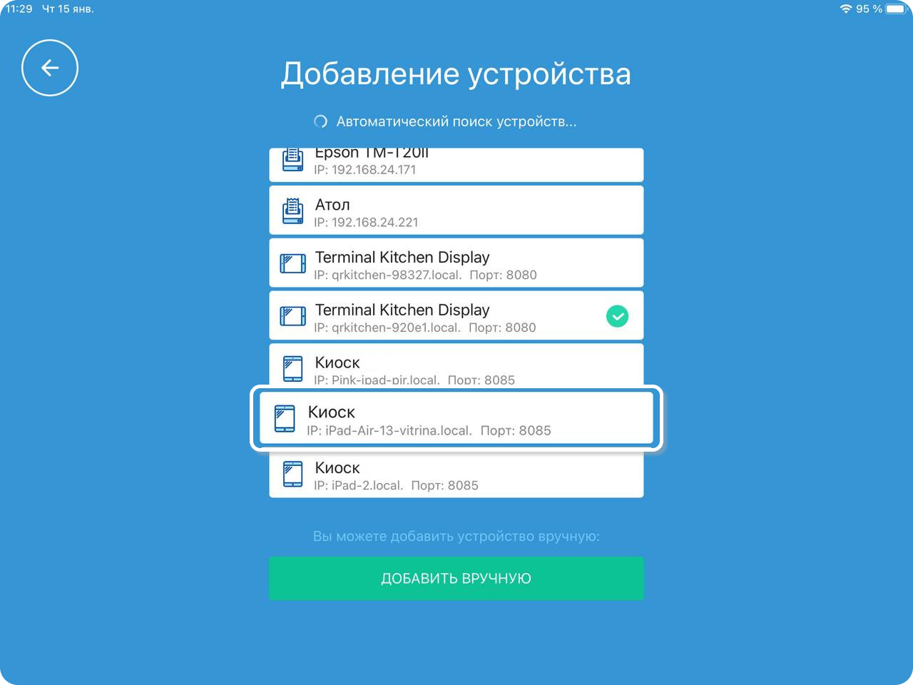 4. Убедитесь, что оба планшета (с кассовым приложением и с Бустер Киоск) подключены к одной сети. Киоск самообслуживания отобразится в результатах автоматического поиска (Киоск). Выберите на него.