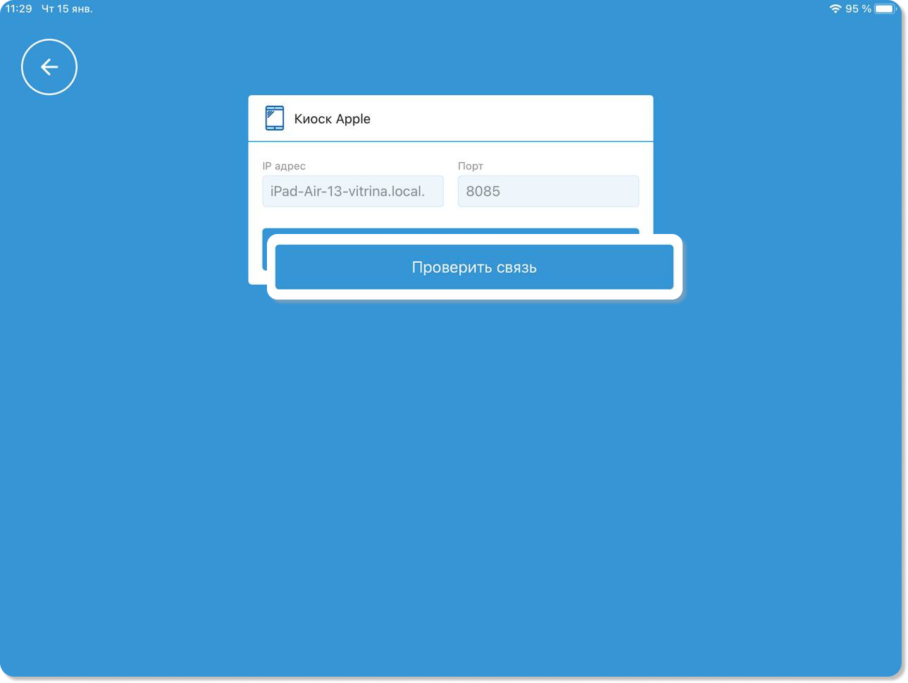 5. Проверьте связь кассового терминала с киоском самообслуживания, нажав кнопку Проверить связь. Дождитесь установления соединения.