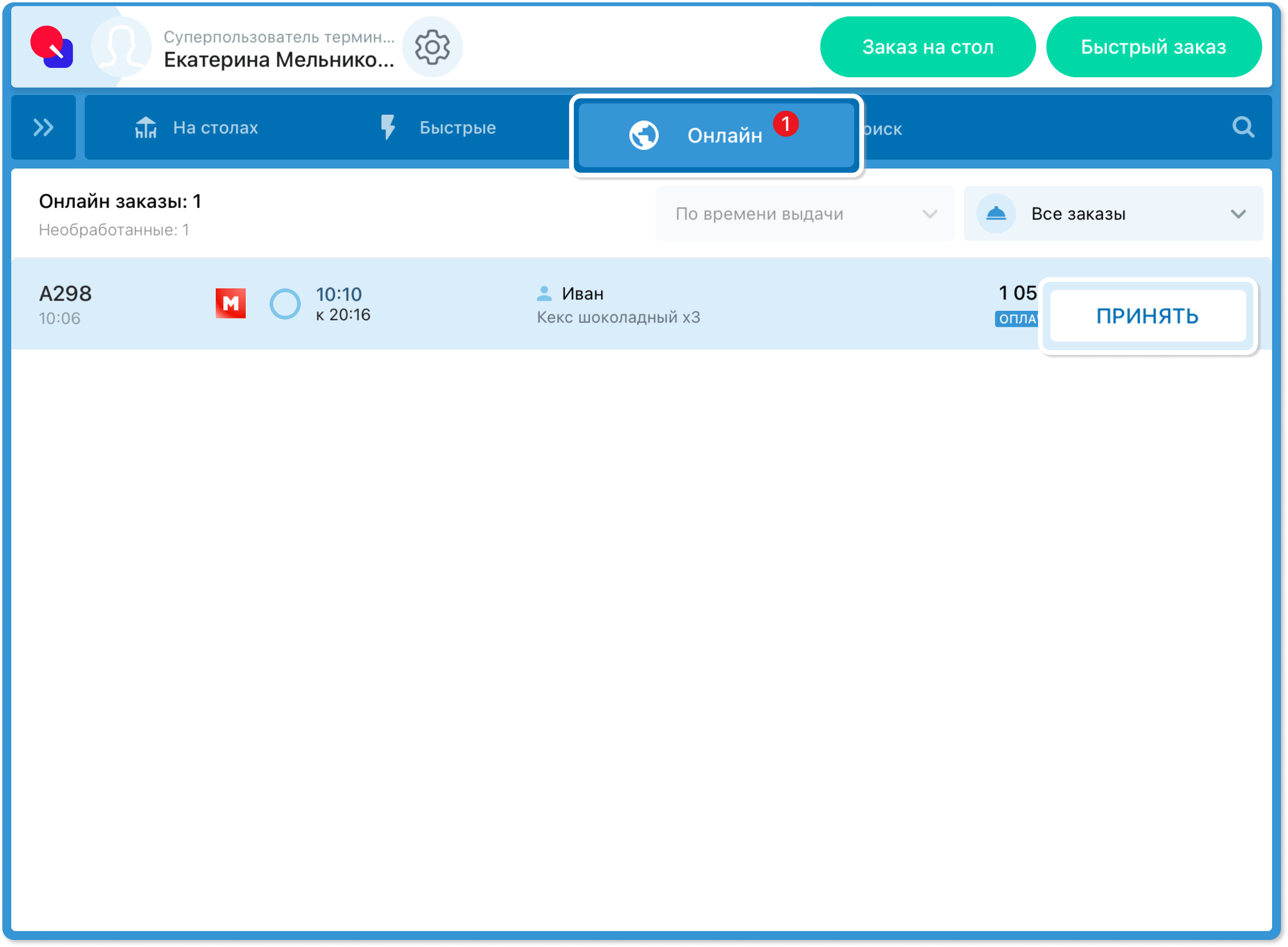2. Заказ поступает на кассовый терминал Quick Resto и доступен для просмотра на вкладке Онлайн заказы.