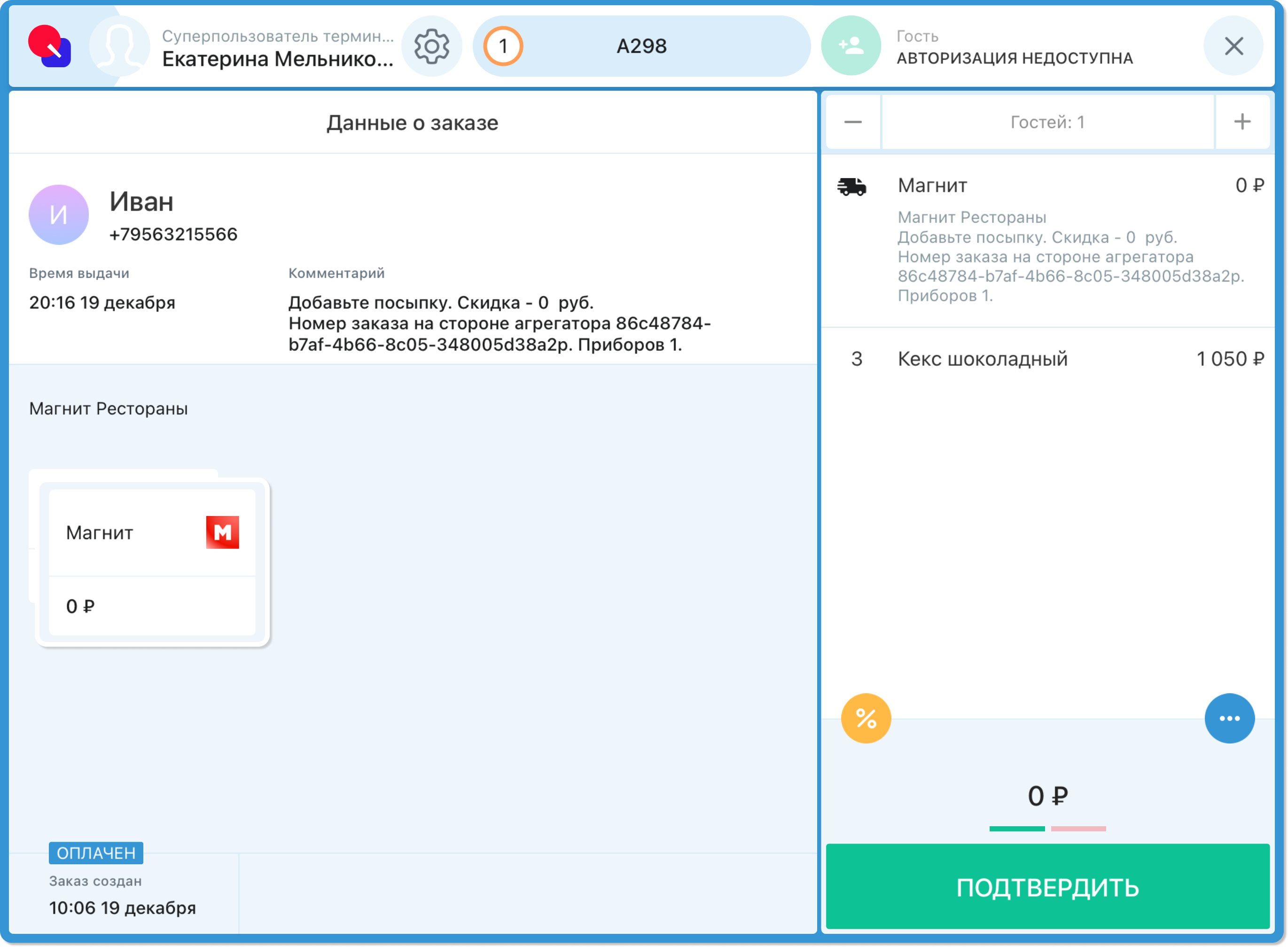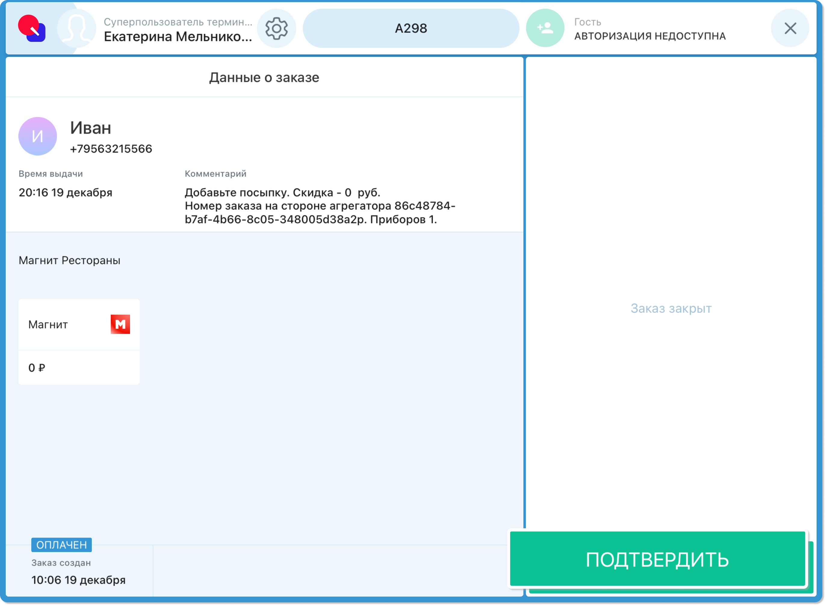 В случае отмены заказа со стороны сервиса Магнит Рестораны, в карточке заказа список блюд будет отсутствовать. В этом случае свяжитесь со службой поддержки Магнит Рестораны и уточните причину отмены заказа. Затем отмените заказ на кассовом терминале. Возврат средств гостю производится сервисом Магнит Рестораны.
