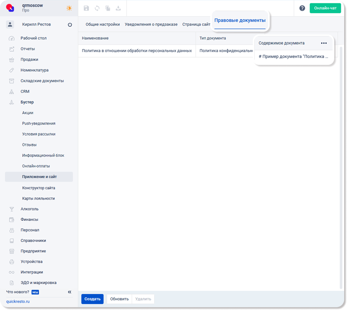 Для настройки Политики конфиденциальности и прочих документов перейдите на вкладку Правовые документы.