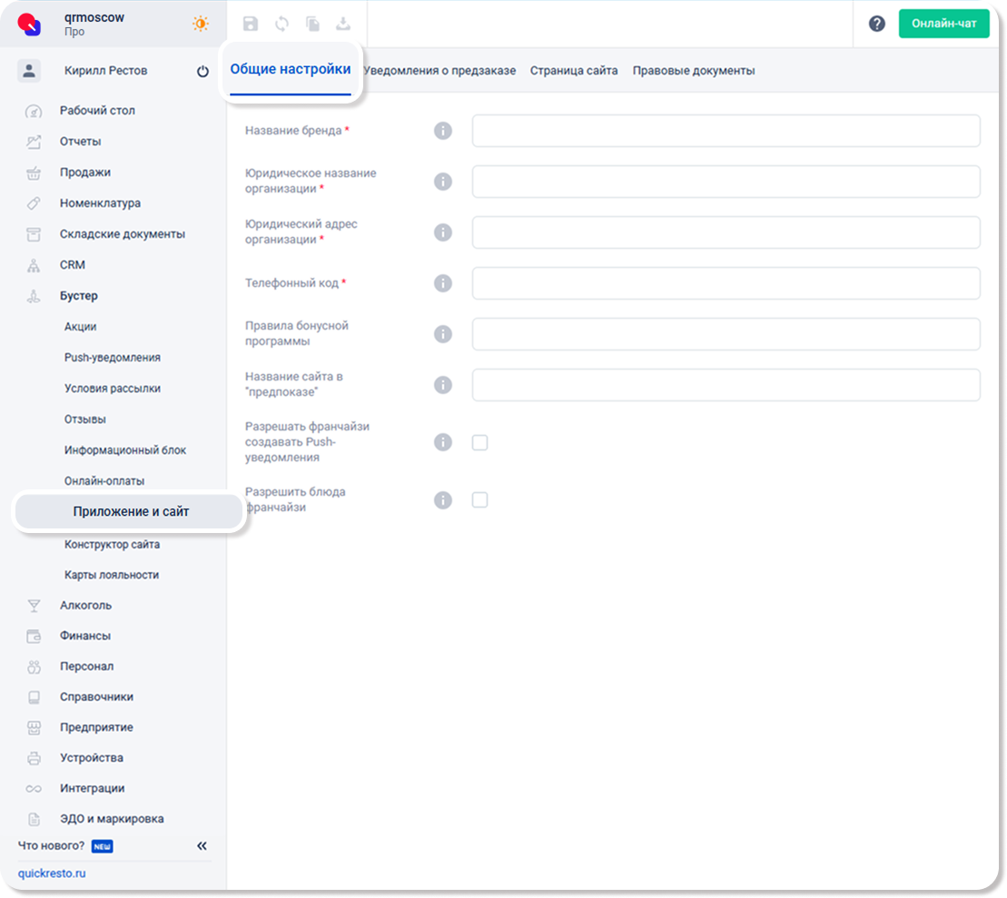 Юридическое название организации и Юридический адрес организации — официальное название вашей организации (например, ООО «Квик Ресто») и адрес, на который она зарегистрирована.