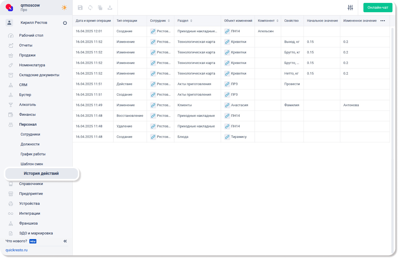Для просмотра совершенных событий перейдите в раздел Персонал — История действий.