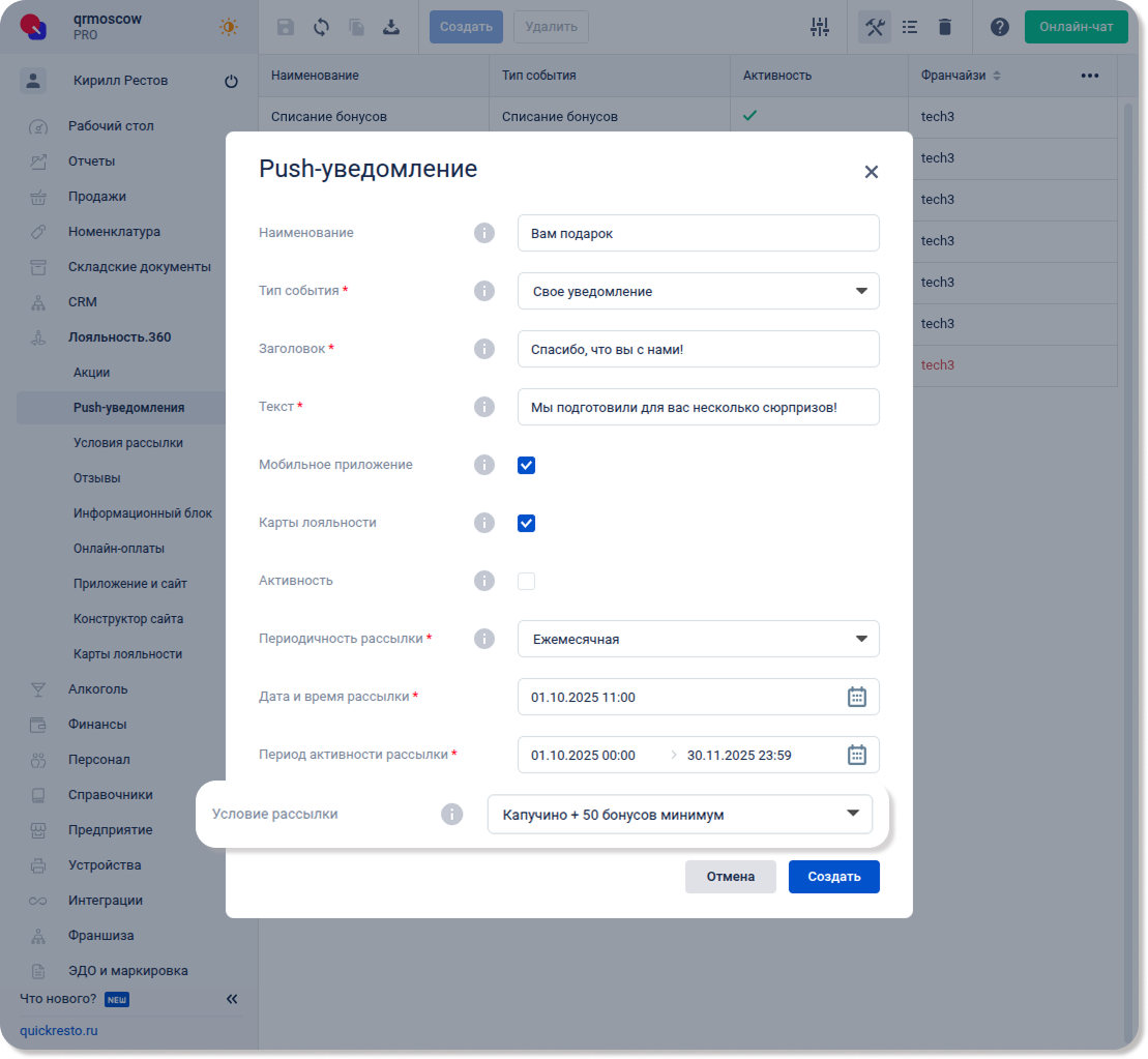Уведомления создаются и настраиваются в разделе Лояльность.360 — Push-уведомления бэк-офиса. Они могут отправляться клиентам при каком-либо событии (например, при начислении бонусов) или в установленное в параметрах уведомления время (например, при информировании о предстоящем событии в заведении).