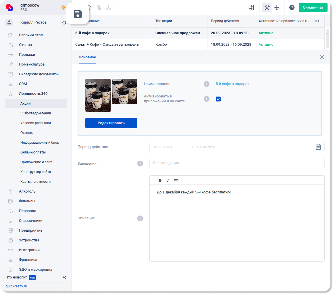 Чтобы акция была активна и активно было ее изображение в приложении для гостей и на сайте заведения, необходимо сделать определённые настройки.