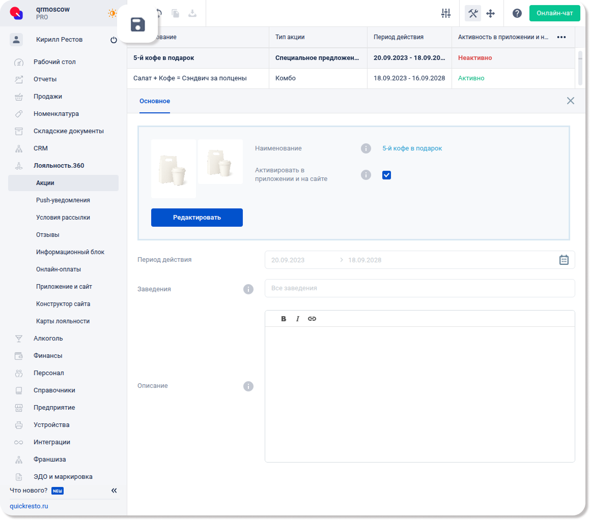 2. Откроется редактор акции. Активируйте флаг в поле Активировать в приложении и на сайте. Данный параметр определяет активна ли акция в приложении для гостей и на сайте заведения.
