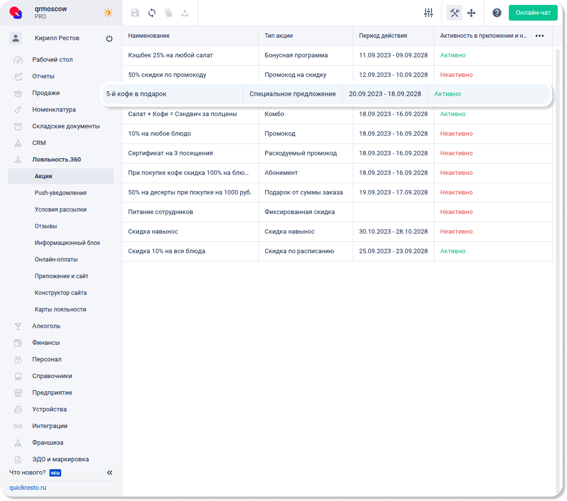 Все акции, созданные в разделе бэк-офиса CRM — Акции, отображаются также и в разделе Лояльность.360 — Акции.