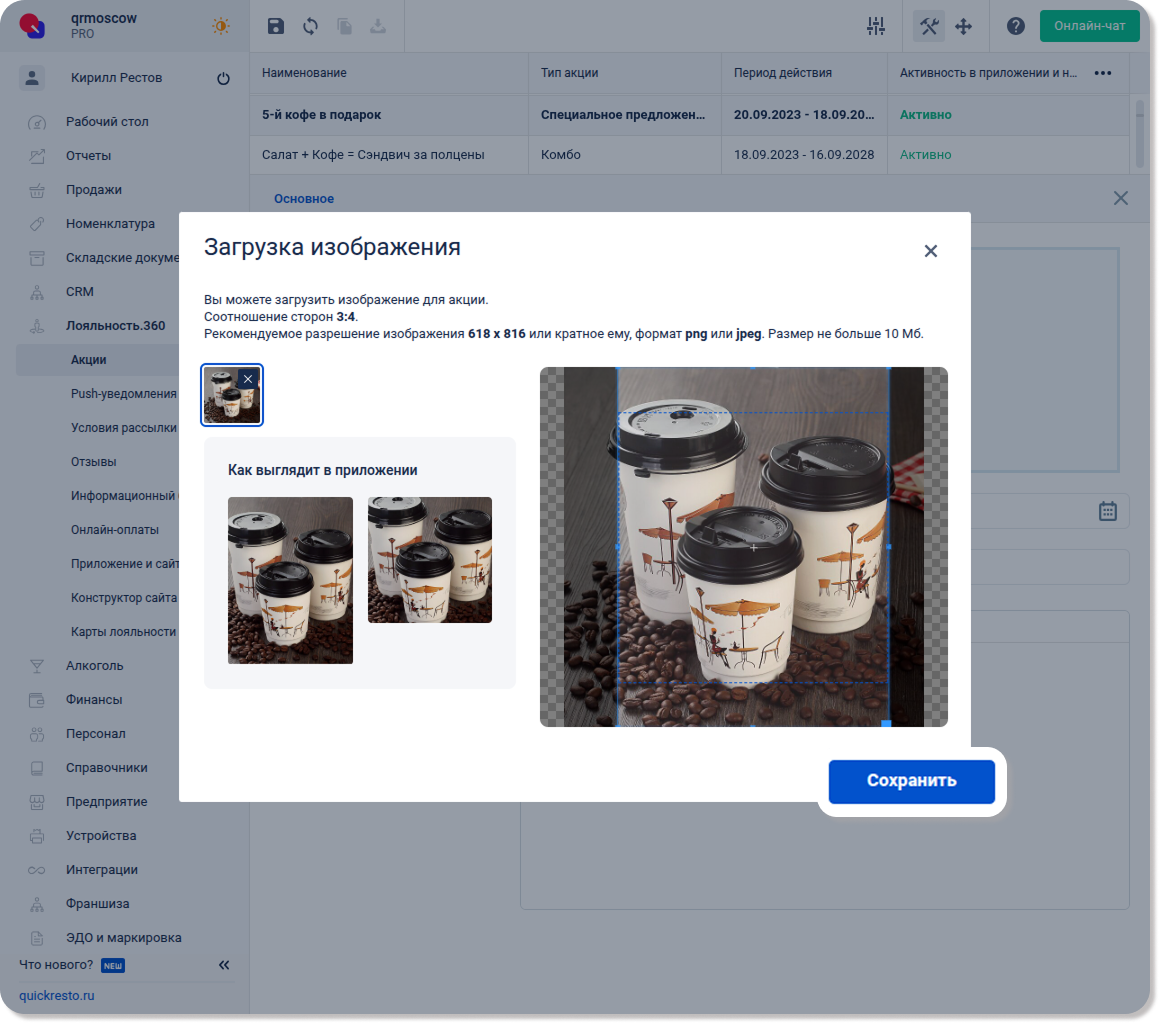 4. Когда изображение загрузится, вы сможете увидеть и отредактировать, как оно должно отображаться в мобильном приложении и на сайте заведения. После этого нажмите на кнопку Сохранить.