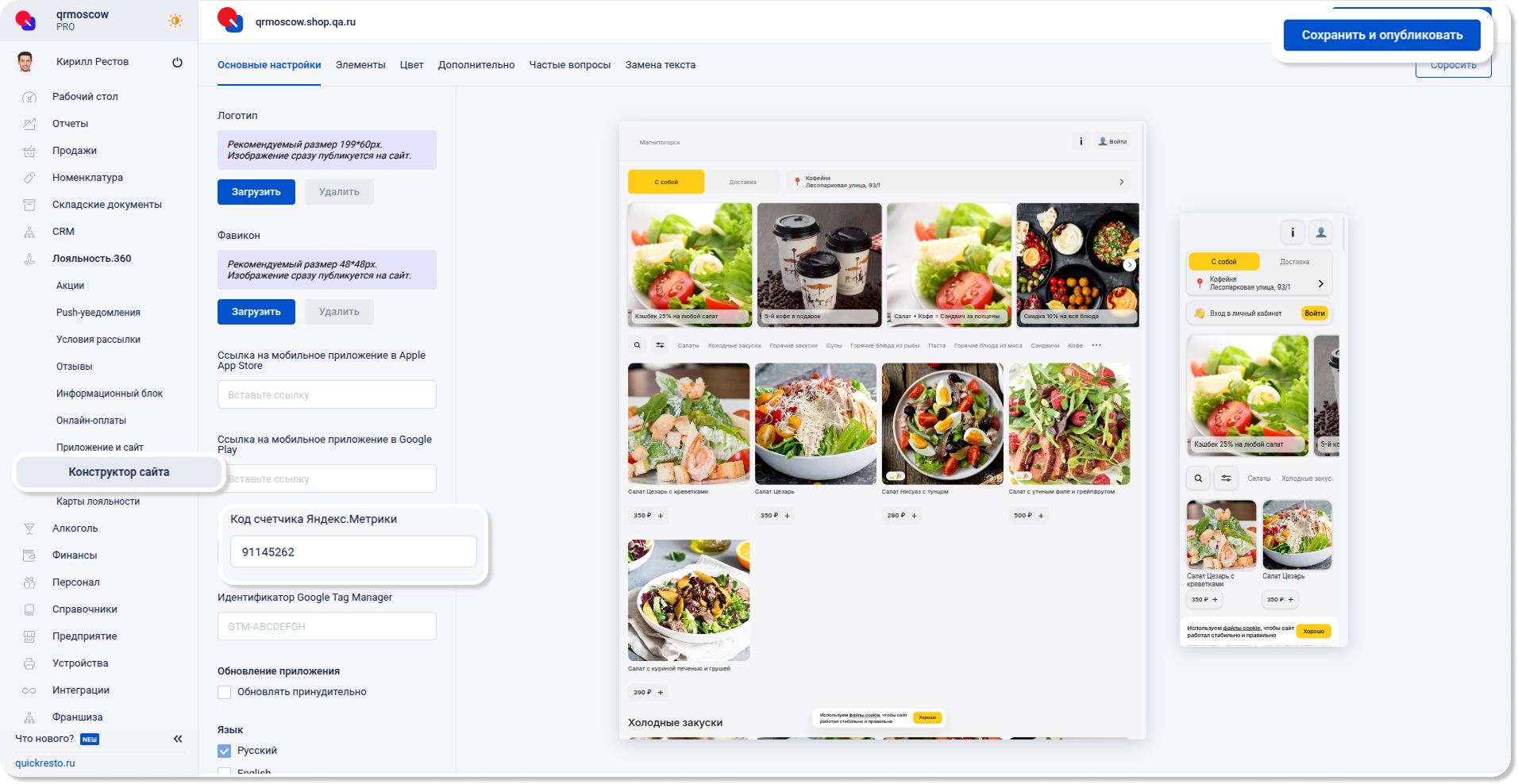 Перейдите на вкладку Общие настройки в разделе Лояльность.360 — Конструктор сайта и вставьте полученный номер счётчика в поле Код счетчика Яндекс.Метрики. Нажмите Сохранить и опубликовать.