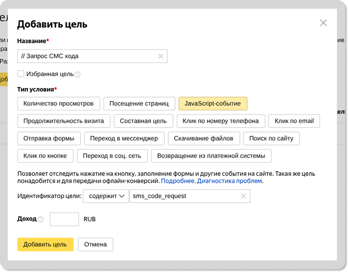 Примечание! Если URL-адрес сайта остается прежним при взаимодействии пользователя с элементами на странице, выберите условие типа JavaScript-событие. Если же URL изменяется, выберите условие типа Посещение страницы.