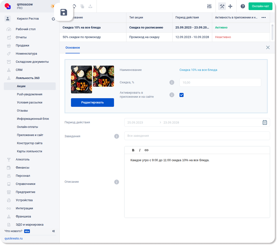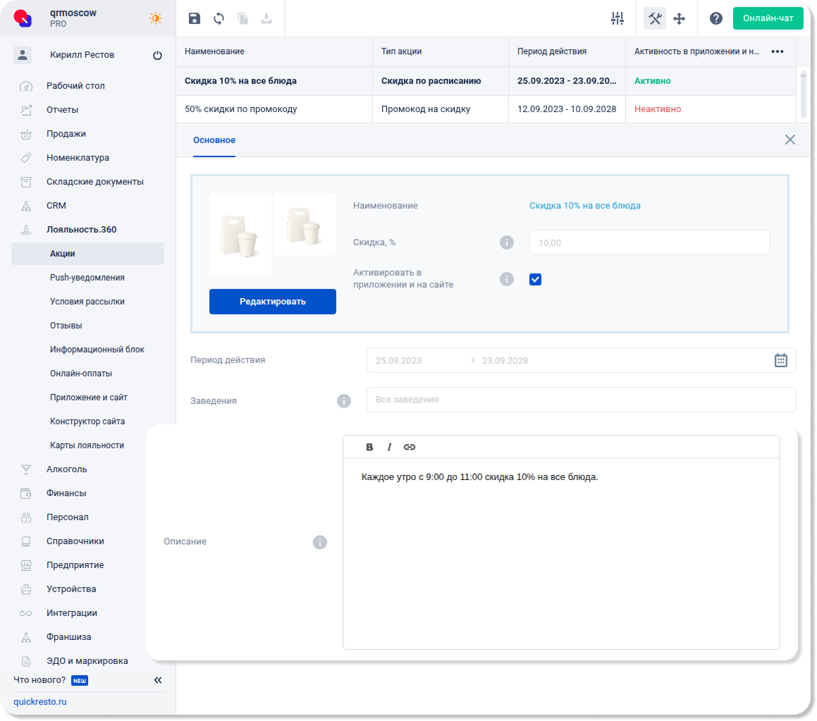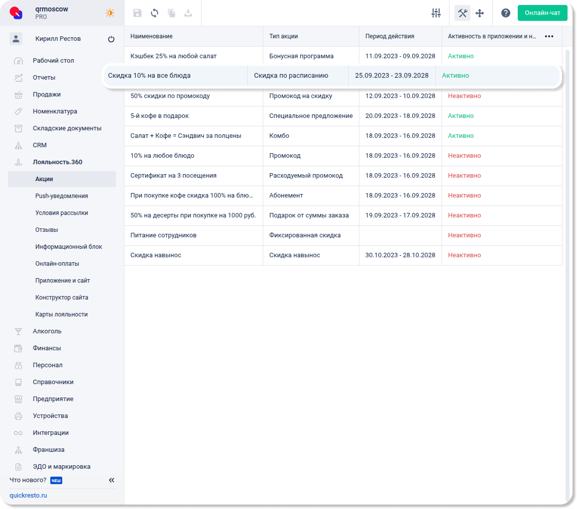 Скидки, созданные в разделе CRM — Скидки, также отображаются в разделе Лояльность.360 — Акции.
