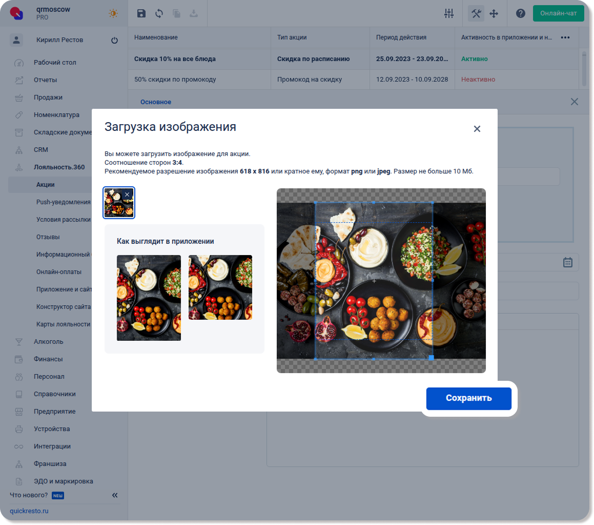4. Когда изображение загрузится, вы сможете увидеть и отредактировать, как оно должно отображаться на сайте заведения. После этого нажмите на кнопку Сохранить.