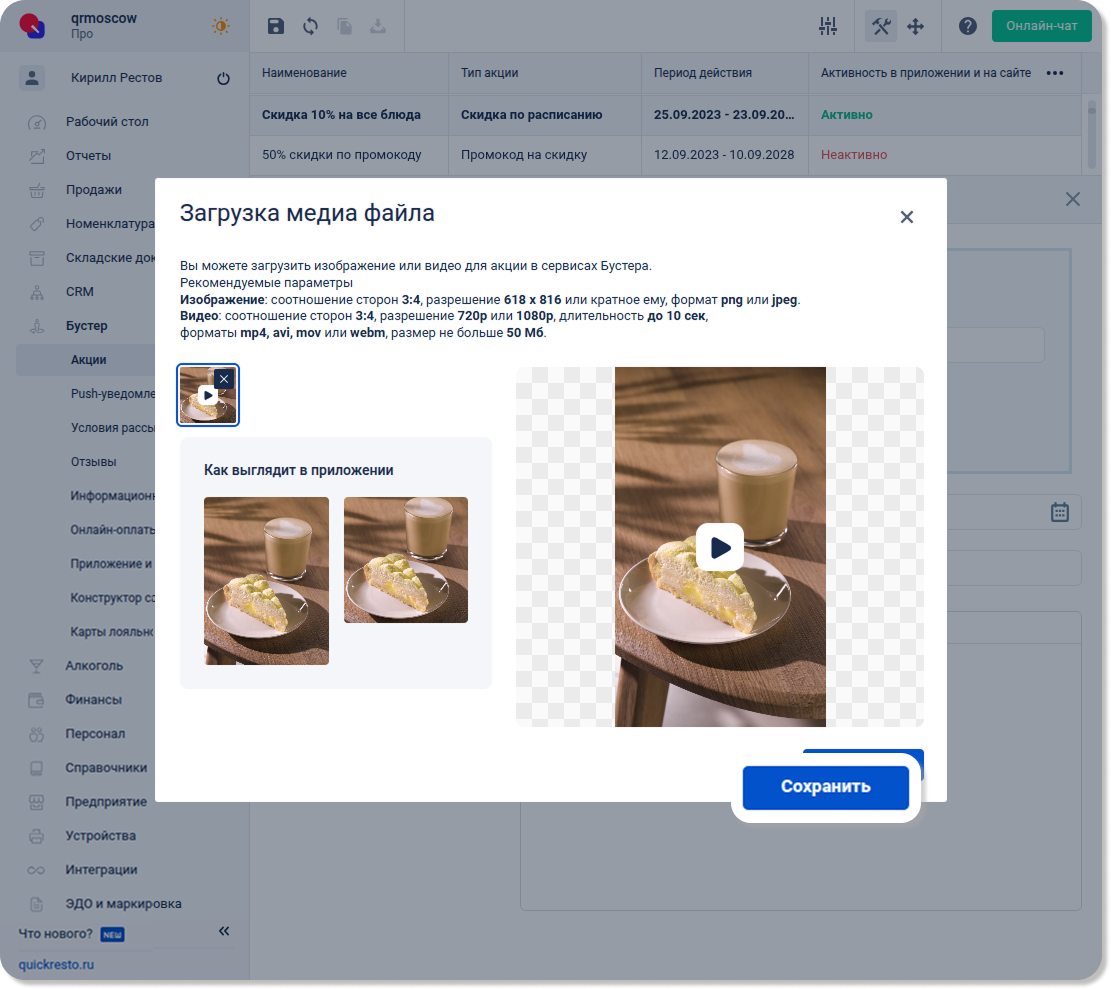 4. Когда изображение (видео) загрузится, вы сможете увидеть и отредактировать, как оно должно отображаться на сайте заведения. После этого нажмите на кнопку Сохранить.