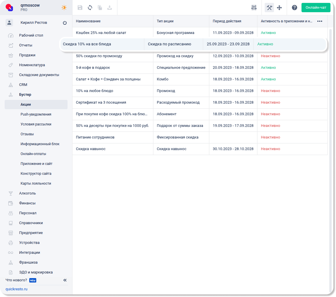 Скидки, созданные в разделе CRM — Скидки, также отображаются в разделе Бустер — Акции.