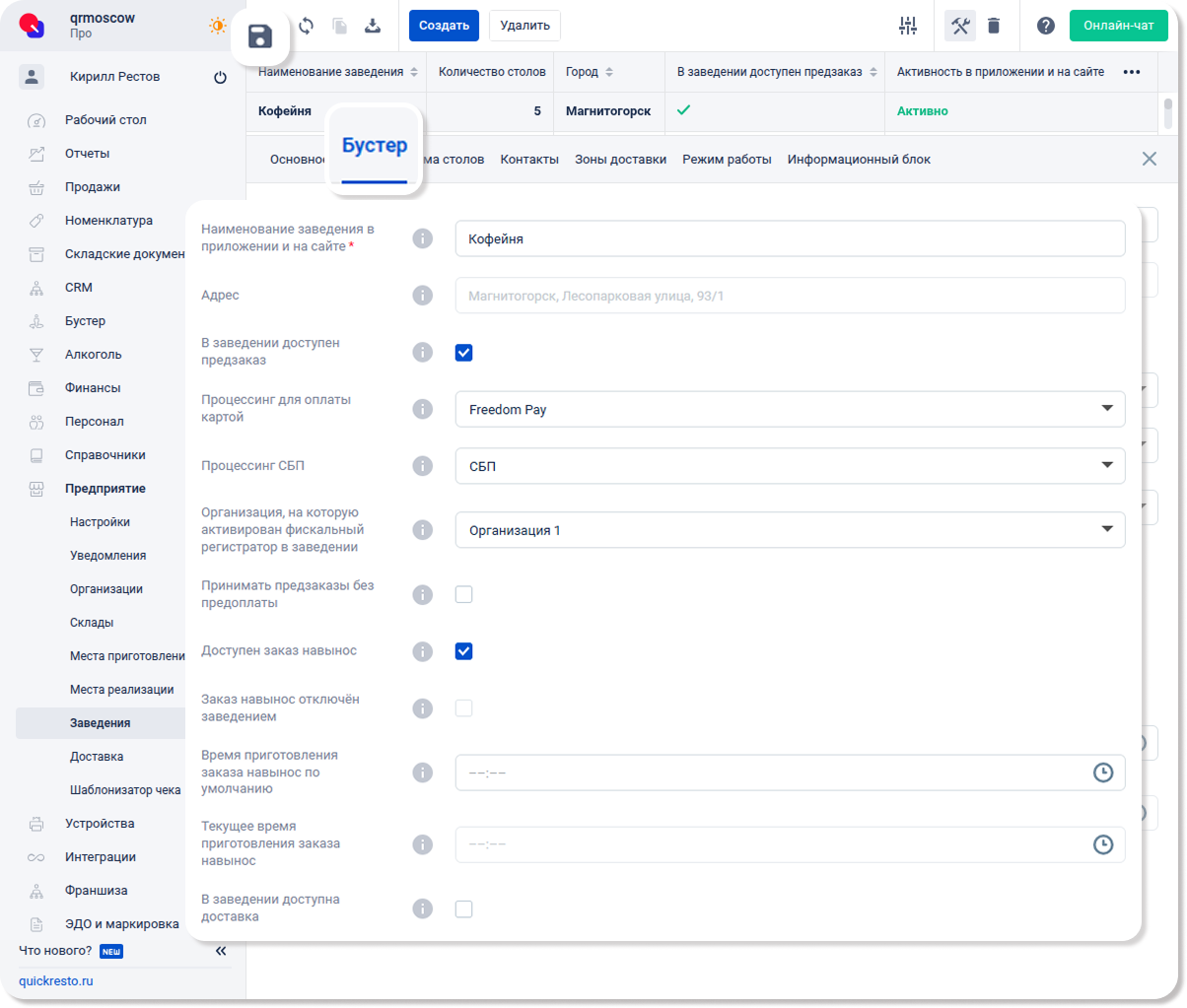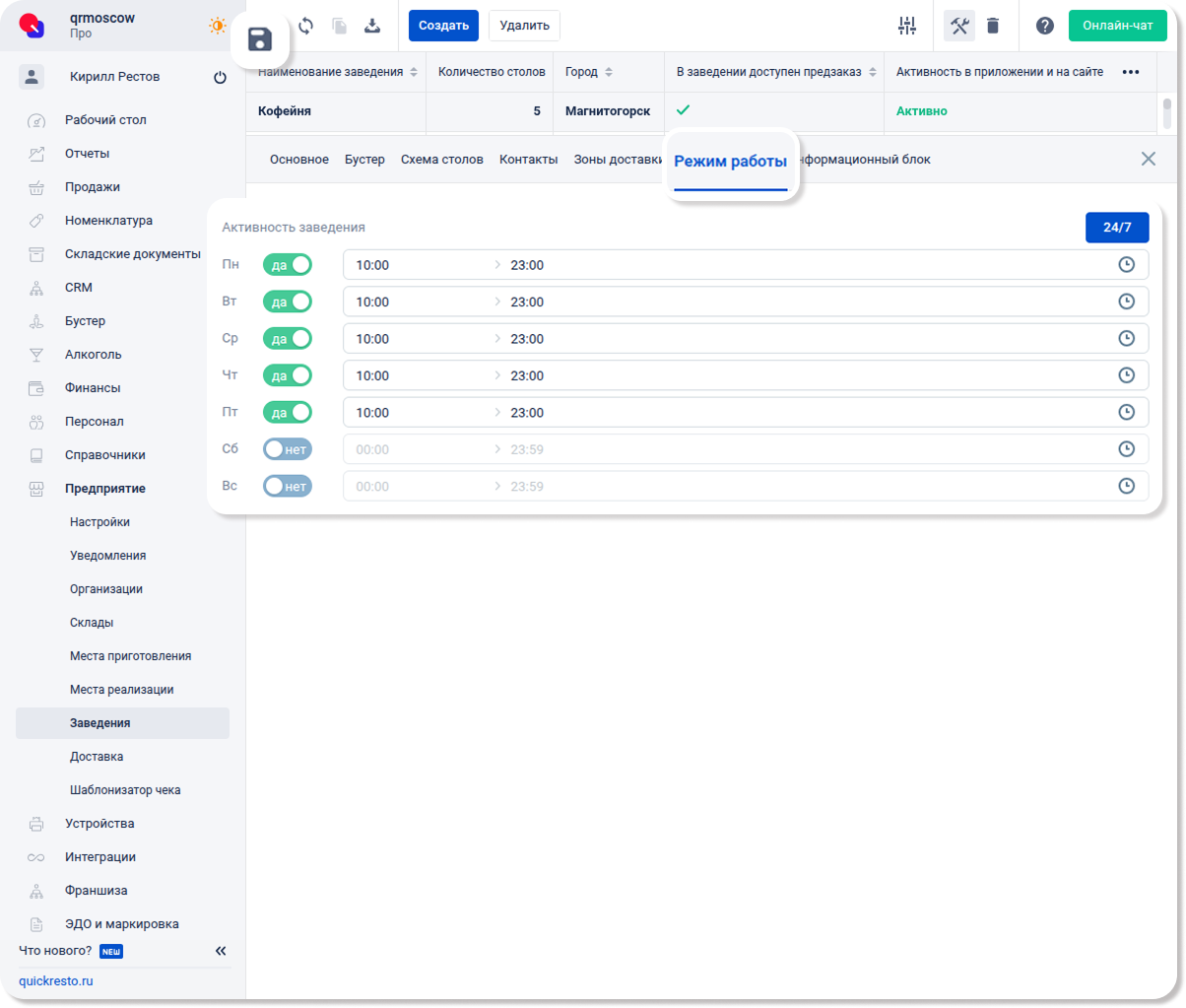Для этого перейдите в раздел Предприятие — Заведения. Выберите то, которое необходимо настроить.