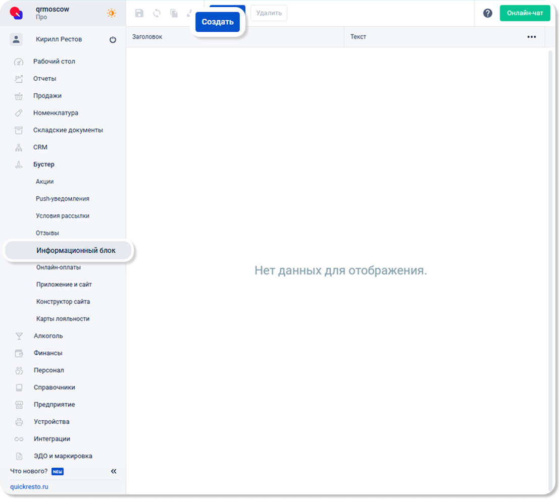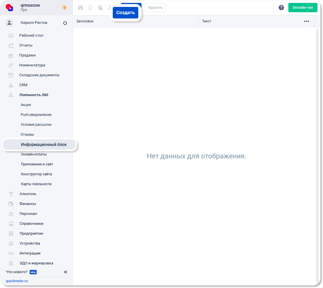 Для создания информационного шаблона, перейдите в разделе Лояльность.360 — Информационный блок — Нажмите Создать на верхней панели инструментов.