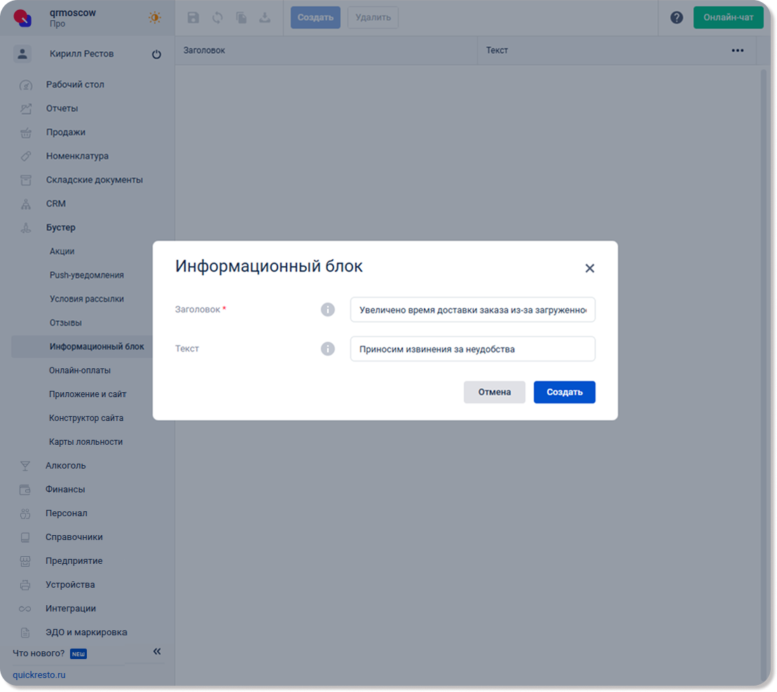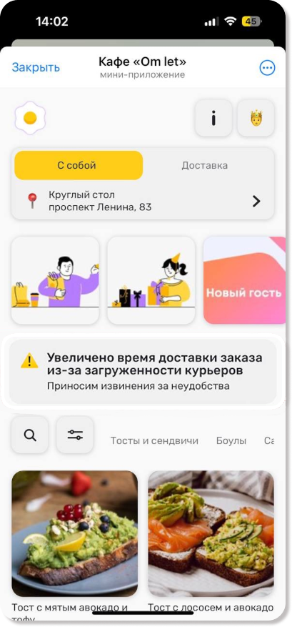 Существуют ситуации, когда заведению необходимо донести важную информацию гостю. Например, отключение электроэнергии в заведении; более долгое ожидание доставки из-за загруженности; временное отсутствие одного из способов оплаты и другое.