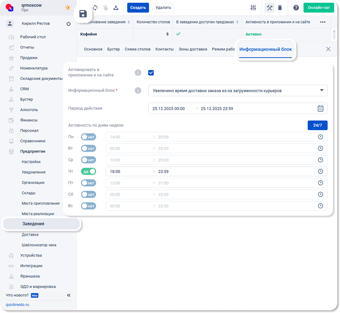 Далее необходимо активировать информационный блок, чтобы он отображался в мини-приложении. Перейдите в раздел Предприятие — Заведения и выберите нужное заведение. На вкладке Информационной блок установите флаг в поле Активировать в приложении и на сайте. Выберите необходимый информационный шаблон, период действия, активность по дням недели и сохраните настройки.