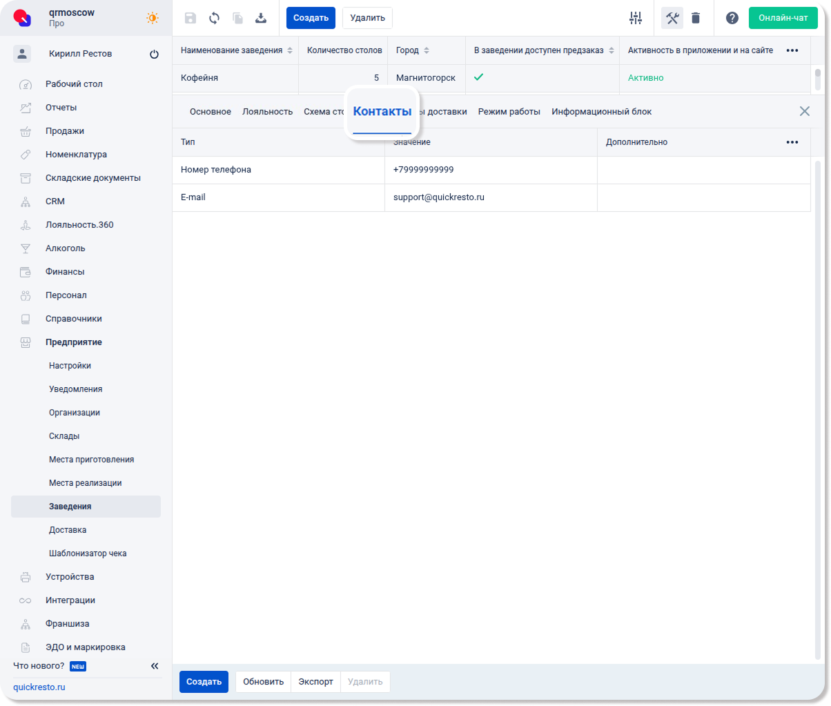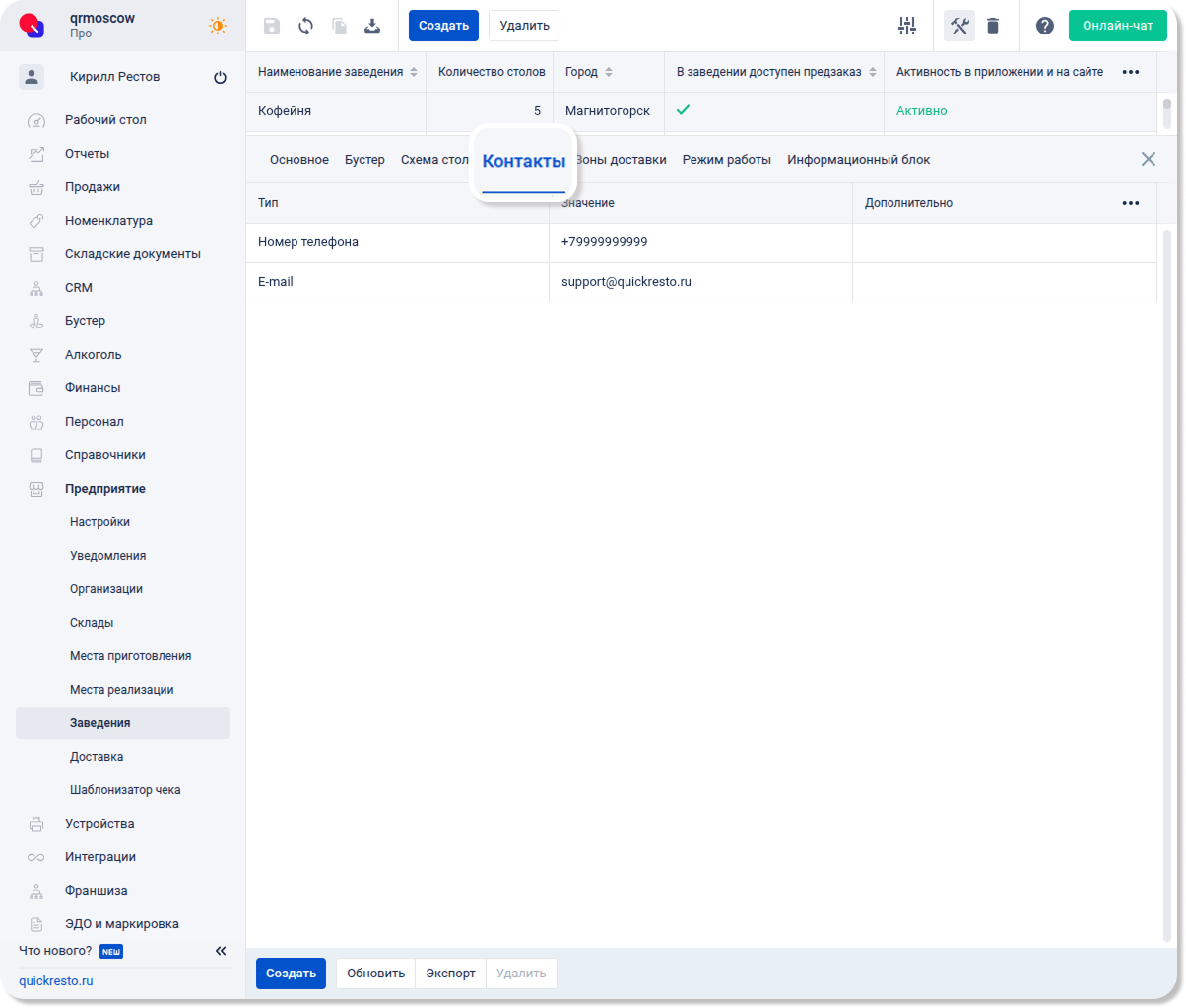 Контакты заведения заполняются в разделе Предприятие — Заведения, на вкладке Контакты. Можно указать номер телефона заведения, а также контакты в мессенджерах и социальных сетях. Дополнительно можно указать ссылки на профили заведения в картографических сервисах 2GIS, Google Maps, Яндекс.Карты.