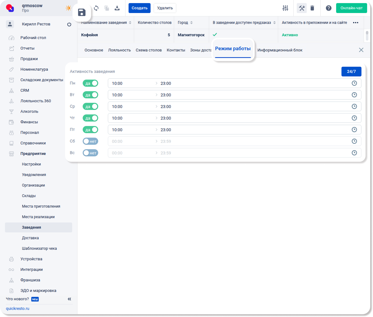 Настроив режим работы заведения, нажмите Сохранить на верхней панели инструментов.