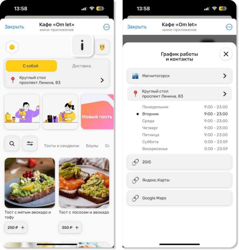 Заведение с заполненной информацией будет отображаться в мини-приложении, при нажатии на кнопку i на верхней панели инструментов. Снизу отобразится график работы, контакты и месторасположения заведения на различных картах.