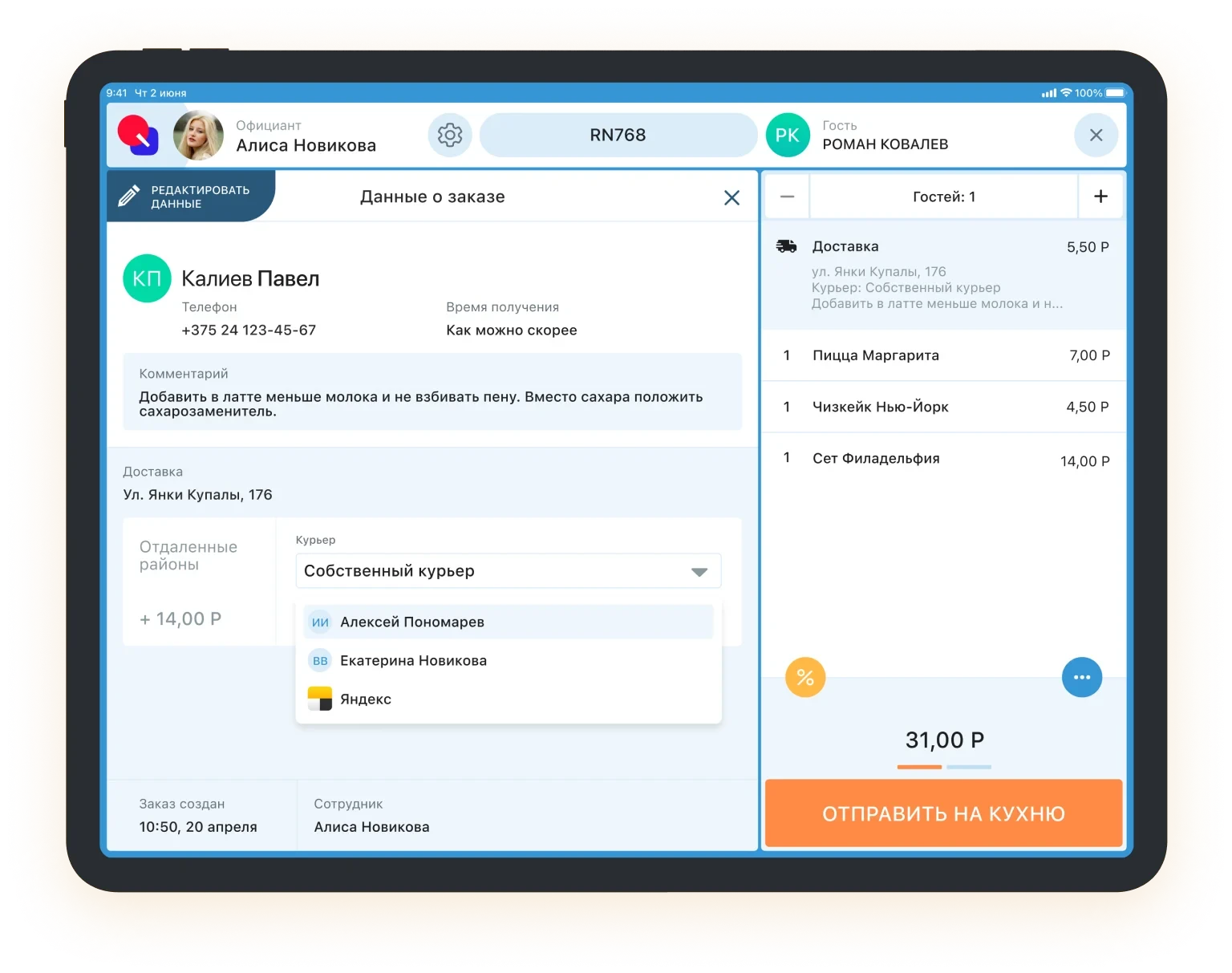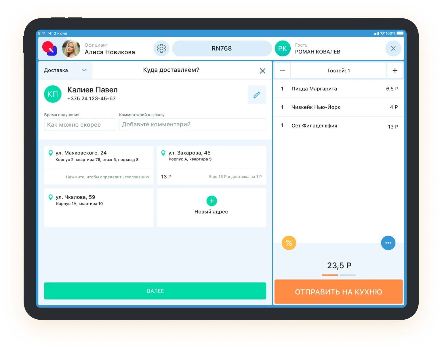 Автоматизация доставки еды позволит масштабировать бизнес. Привлекайте заказы через собственный сайт заведения или приложение. Подключайтесь к агрегаторам Яндекс.Еда и Delivery Club и расширяйте базу клиентов. Модуль доставки освобождает от установки множества приложений. Заказы из агрегаторов, с сайта и мобильного приложения для гостей отображаются в едином интерфейсе. Обрабатывай заказы с того же терминала, который используется в зале. Автоматизация превращает бизнес-процессы в слаженный механизм. Заказ из мобильного приложения приходит на кассовый терминал. Повара видят новые заказы на собственном экране на кухне. Программа подаст повару звуковой сигнал и посчитает затраченное время приготовления. Для сборщика заказов печатается специальный чек. Сотрудник сразу понимает, что и где забрать, и не тратит лишнее время. А довольный гость быстро получает заказ и оставляет хороший отзыв о скорости обслуживания. Распредели доставку еды между курьерами агрегаторов и своими сотрудниками. Это поможет в пиковые часы заказов. Управление происходит прямо с кассового терминала. Если заказ просрочен, кассовый терминал сообщит в уведомлении. Введите имя или телефон клента — карточка с адресом доставки отобразится на экране. Если гость ещё ничего не заказывал, карточку можно быстро создать. Гость видит акции и статусы заказа в личном кабинете: оплачен, отправлен на кухню, готов. А потом можно оставить отзыв или повторить свой заказ.Модуль расчета доставки